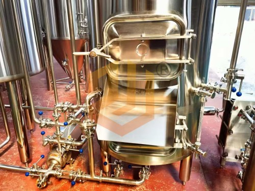 過濾槽與旋沉罐:采用上下兩層的設(shè)計(jì)方式,整體占地面積小,過濾槽采用銑制篩板,頂部采用異型人孔設(shè)計(jì),側(cè)面配有出糟口,方形人孔門設(shè)計(jì)更有利于啤酒麥糟的清理工作,同時還配有出糟板。內(nèi)部配有耕刀裝置,用于疏松麥糟層以及出糟使用。
